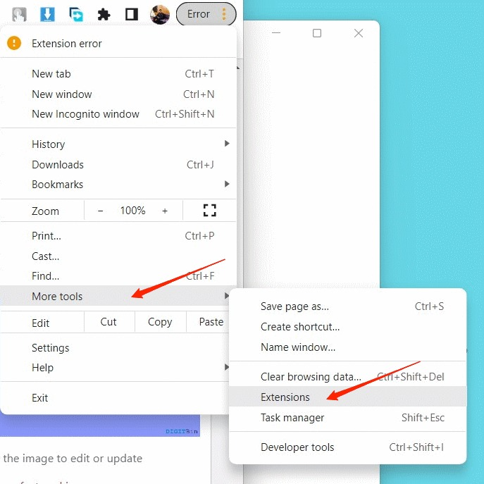 - Open Chrome Browser, go to ‘More Tools’, then open ‘Extensions’.